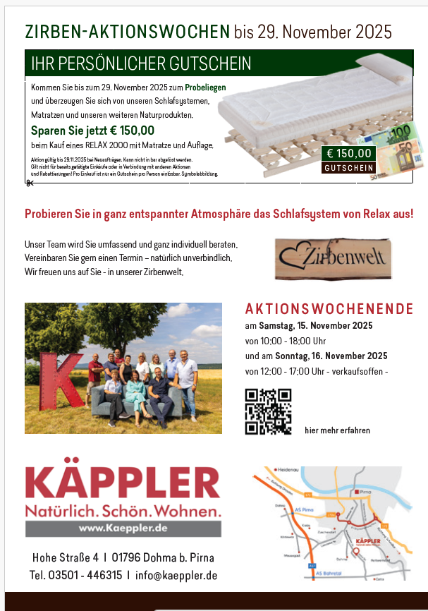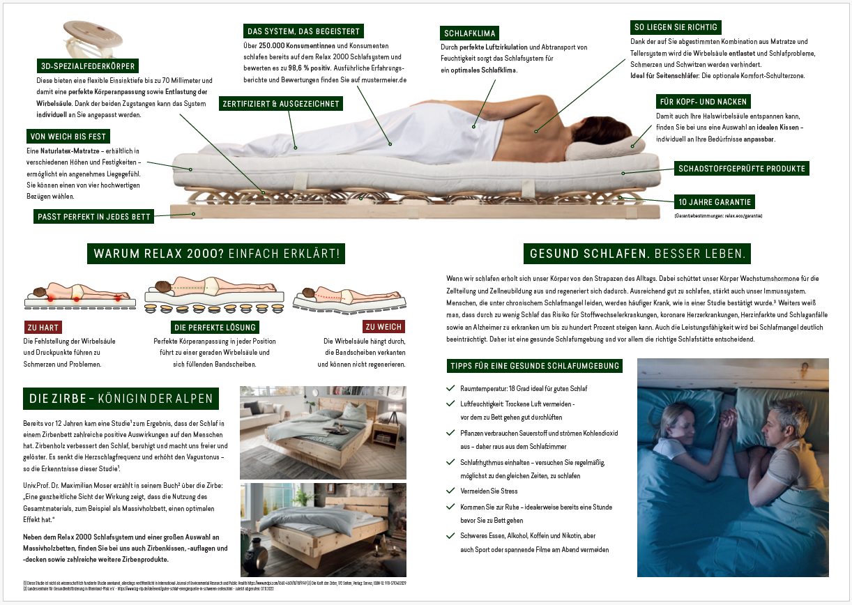 Kommen Sie an unserem Aktionswochenende vorbei und lassen Sie sich ausführlich beraten, um besseren und gesünderen Schlaf zu finden. Entdecken Sie unsere neuesten Matratzen- und Lattenrostsysteme aus Zirbe, aktuelle Boxspringbetten, und natürlich unsere Massivholzbetten.