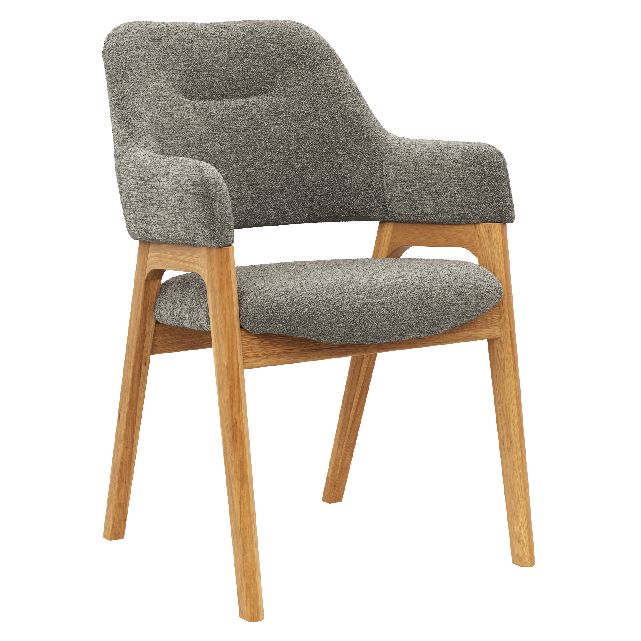 Erlebe Komfort und Stil mit dem Armlehnstuhl Flore 1 von Natura Home. Der Stuhl verleiht jedem Raum eine elegante Note dank seines steingrauen Stoffbezugs. Die Sitzhöhe beträgt ca. 49 cm und die massive Wildeiche in Holzfarbe sorgt für Stabilität und einen natürlichen Look. Der Schaumstoff in Sitz und Rückenlehne bietet langanhaltenden Komfort. Mit einer Belastbarkeit von ca. 120 kg ist der Stuhl robust und langlebig. Die vier Füße aus massivem Wildeichenholz verbinden ästhetisches Design mit funktionaler Stabilität, was den Armlehnstuhl Flore 1 zu einer idealen Ergänzung für Dein Zuhause macht.