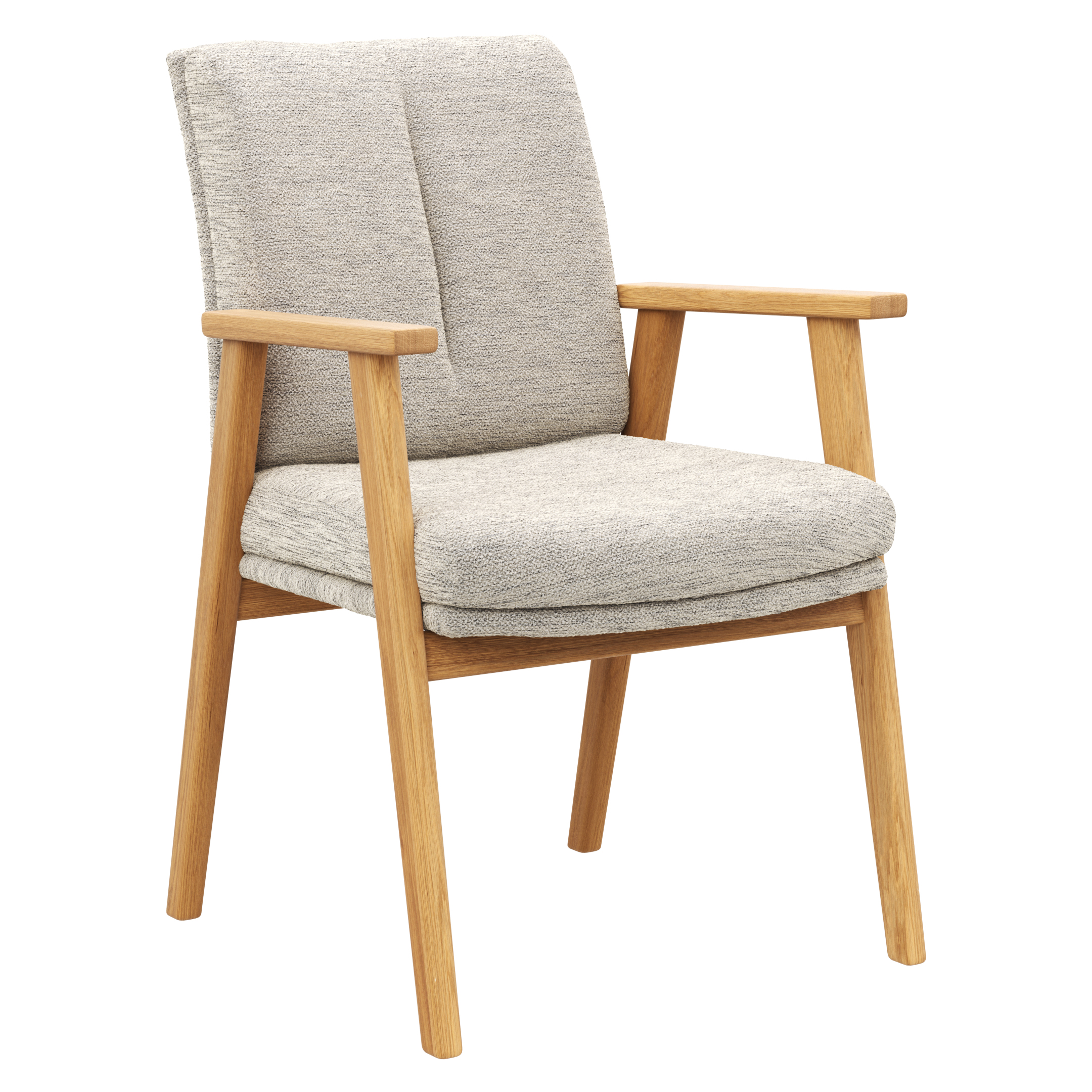 Erlebe höchsten Komfort mit dem Armlehnstuhl Flore 2 von Natura Home. Der Stuhl beeindruckt durch seine elegante cremefarbene Stoffpolsterung, die sowohl Sitz als auch Rückenlehne aus weichem Schaumstoff umfasst. Die ca. 49 cm Sitzhöhe bietet optimalen Komfort für ausgedehnte Sitzeinheiten. Die massiven Wildeichenfüße in Holzoptik verleihen Stabilität und halten bis zu ca. 120 kg aus. Die klassische 4-Fuß-Form sorgt für einen zeitlosen Look, der sich nahtlos in jedes Interieur einfügt. Perfekt für alle, die Wert auf Qualität und Stil legen.