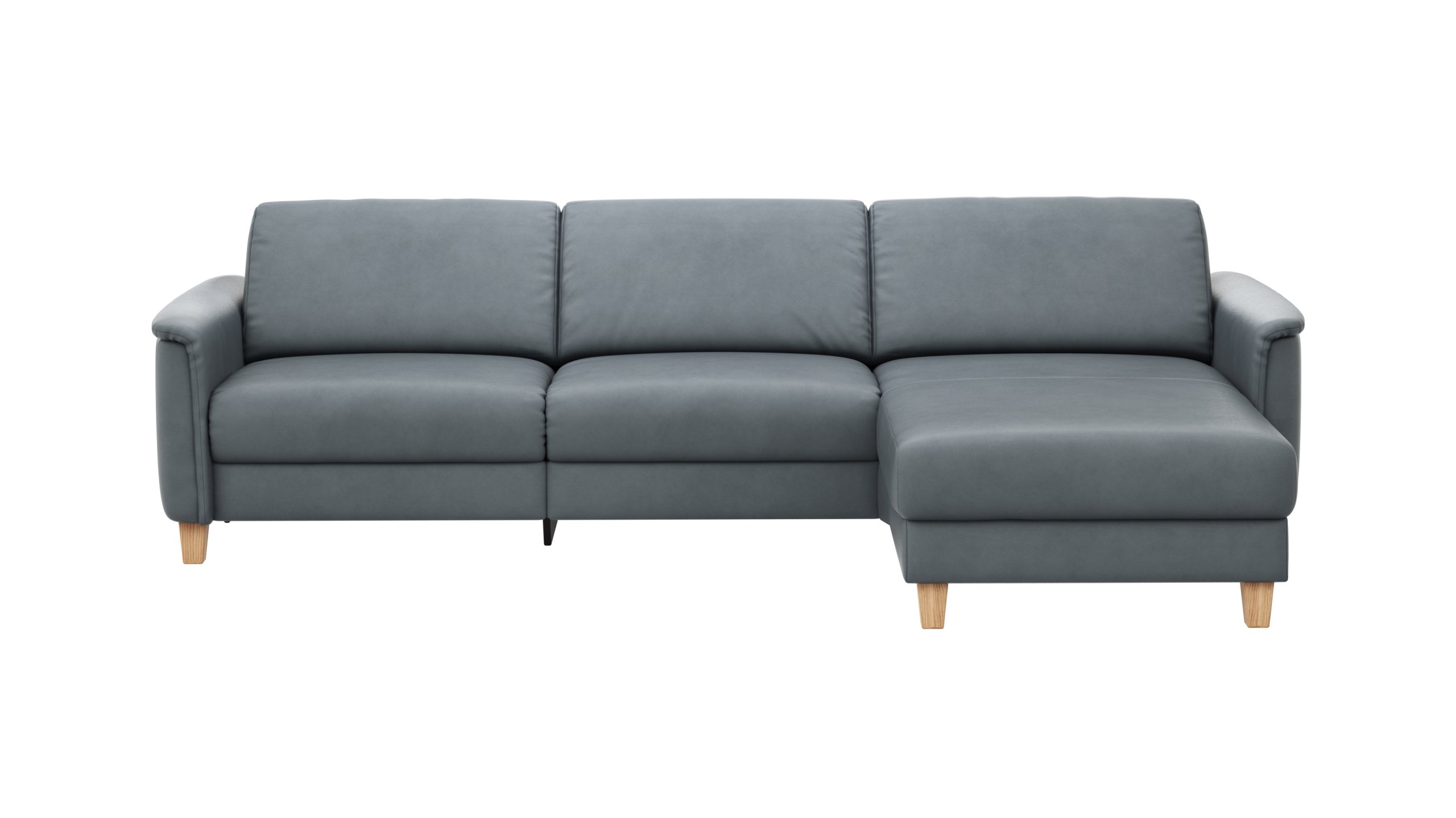 Bezug: Leder E touch steel, PG. E, Füße: H3 Eiche hell, Seitenteil: 2, Sitz Soft (weich) ,bestehend aus: 2,5-Sitzer mit TV-Funktion motorisch AT.links und Longchair standard AT. rechts inkl. Bettkasten